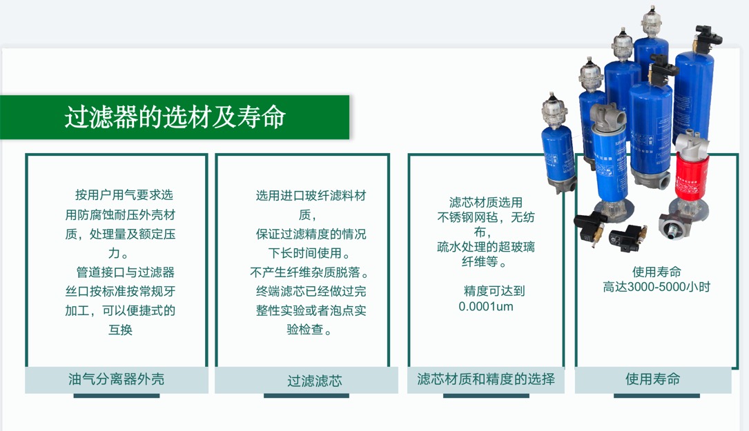 空壓機后置管道過濾器采用防腐蝕碳鋼殼體及進口濾芯材質(zhì)對氣體中的粉塵油水進行直接攔截,精濾芯過濾,去除氣體中的粉塵油水污進行精過濾。完成氣體潔凈度為:出氣含塵量:≤0.001um,出氣殘油量:≤0.001ppm